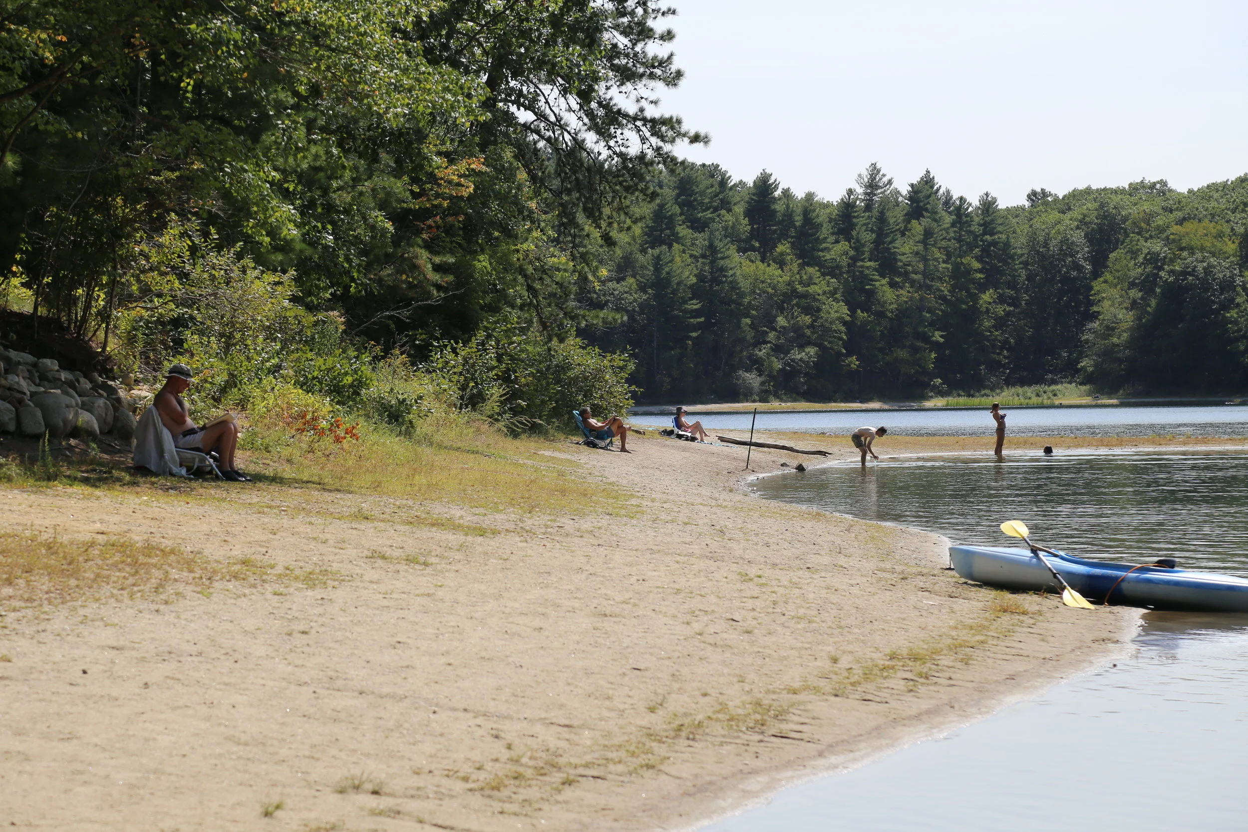 彼の過ごした池は本当に美しい、天国のような場所だった。美しい森に囲まれた氷河からできた湖は透き通ったブルーが美しく、水底まで透けて見えるほど。ゴミも一つも落ちておらず、泳いでいる魚の動きも全て見通せるほどだった。水は冷たく過ぎず、足をひたすと気持ちがいい。ビーチには家族連れの人たち、日光浴をする人、泳ぐ人、釣りをする人、ボートやカヌーを楽しむ人、そして読書をする人などでまばらに賑わっていた。たまに子供の笑い声や鳴き声が聞こえるけれど、風の音と虫の声、木々のさざめきしか聞こえない、本当に美しい場所だった。天気も相まって、本当にこの瞬間この場所にいてよかったと思う。彼の愛したという1.7マイルの湖の畔を歩くと、涼しい風が身体に心地よい。彼の愛した湖は今では人々に愛される憩いの場として生まれ変わっていて、彼の提唱した概念というものからは離れてしまっているかもしれないけれど、それでも十分に尊く美しい瞬間だった。特に、本を読んでいる人を見かけると、この池の意味というのがわかってくるような気がした。風や音は秋晴れの空に抜けていき、本当に静かだった。